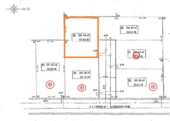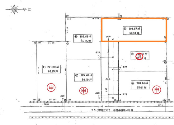 上水道 下水道 側溝 電気使用する際私設柱が必要となる場合があります。 BCD区画には私道持分があります。